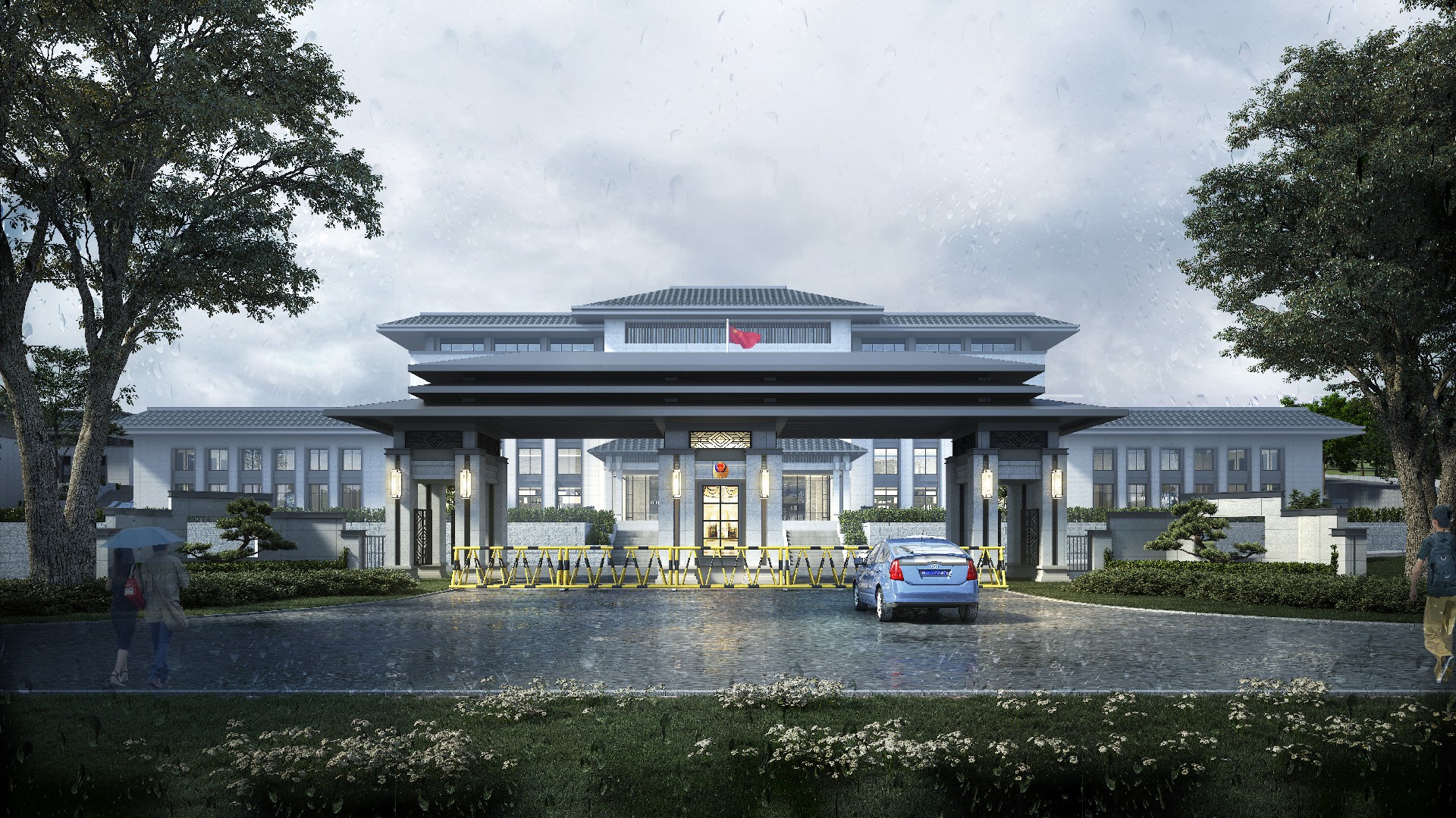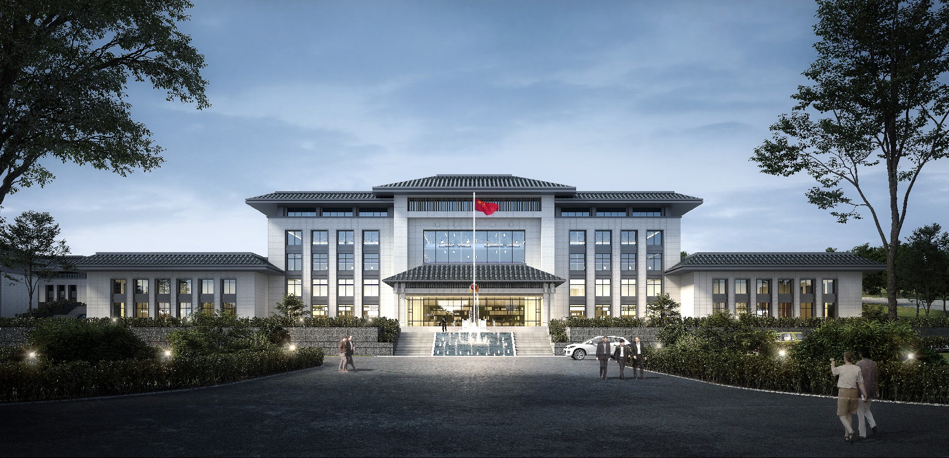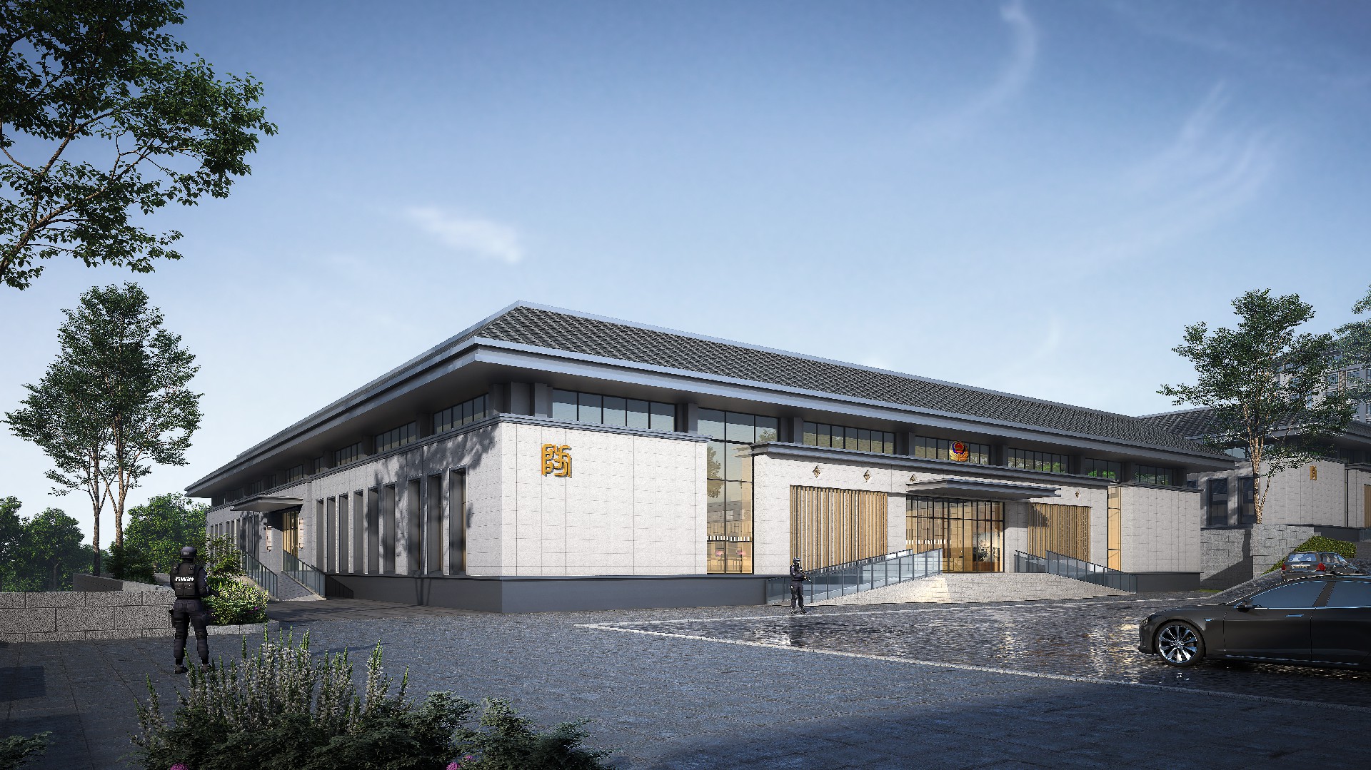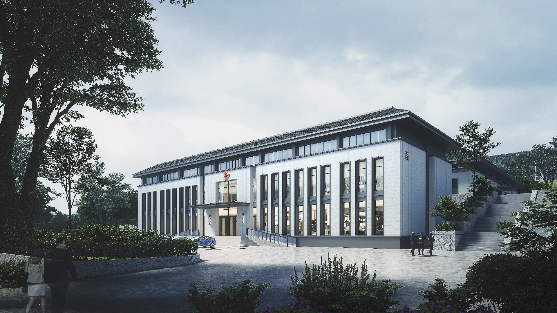山东出入境边防检查总站轮训大队(南山)营区改造设计项目,总占地面职约 200 亩,对营区内主要建筑及附属设施进行功能改造,改造面积约总建筑面积约 1.6万平方米。"一人之形象,国家之缩影;一人之举止,民族之风貌。边防检查人员的形象和服务至关重大。本项目整体规划格局庄重大气,建筑效果协调统一,室内装饰温馨舒适,充分考虑该地块地形现状,结合现有道路情况,通过设置多个台地解决场地内高差及功能分区的需求。本设计全面展现项目生态性、智能化。信息化、安全性等特色,倡导绿色健康、可持续发展的建筑模式。建筑整体设计大方、庄重.典雅,在设计细节上体现项目优良品质。